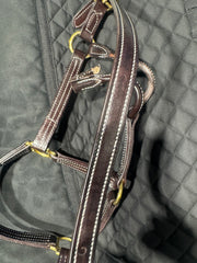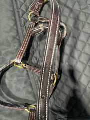 Le licol pour lequel nous sommes connus ! Il n'y a pas de licol sur le marché aussi intemporel et classique que notre licol britannique. Triple couture (coutures blanches) avec un menton droit et un bouton-pression au niveau de la gorge, c'est tout simplement un must have.